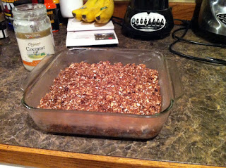 Mix the above ingredients until a thick sticky batter is formed. Be patient, it’ll take awhile. Lightly rub a 9 x 9 baking dish with a tiny bit of coconut oil to prevent the bars from sticking. You could also use a bit of cooking spray, but coconut oil is better for you! Smash the dough into the baking dish. Refrigerate overnight. Slice into 9 bars.