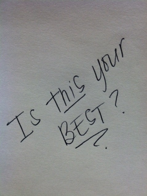 Let me tell you what I don’t want you to envision when you ask yourself, “Is this your best?” I don’t want you to think about that crotchety old tee ball coach that you had when you were 5 years old that sarcastically barked out, “Is that the best ya can do??” when you swung like a dickens at the ball with all of your might with what you were certain was laser-like precision and were utterly devastated (and surprised) when you missed.** No, no. I want you to imagine leaning in, looking yourself in the eyes and, with an expression of care and concern, asking yourself, “Is this your best?”